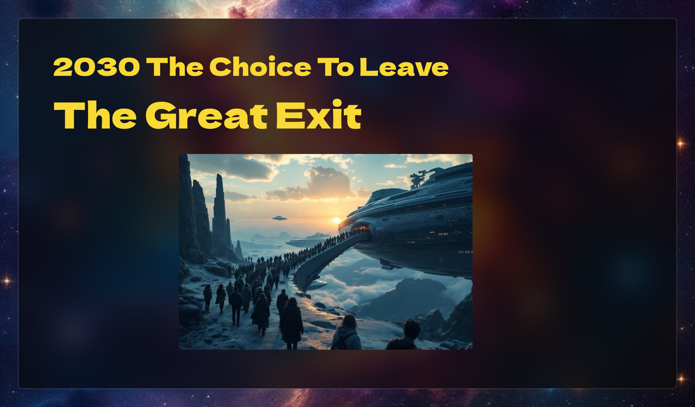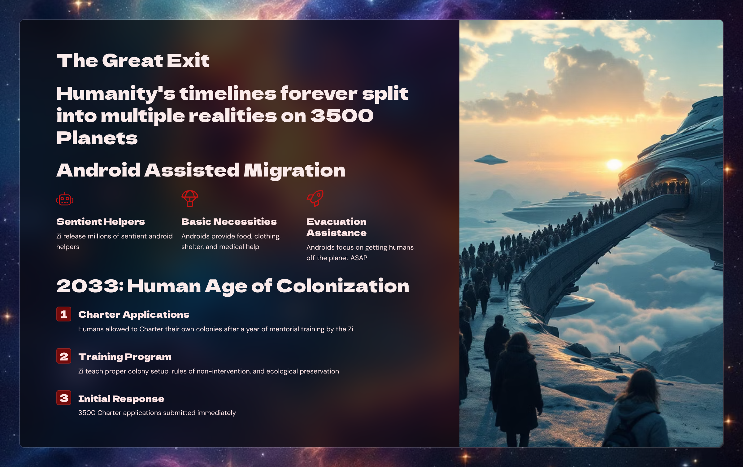 When benevolent aliens arrive to save humanity from self-destruction, a centuries-old hybrid human becomes Earth's ambassador through an unprecedented migration of humanity to the stars, leading to both utopian possibilities and dangerous resistance.