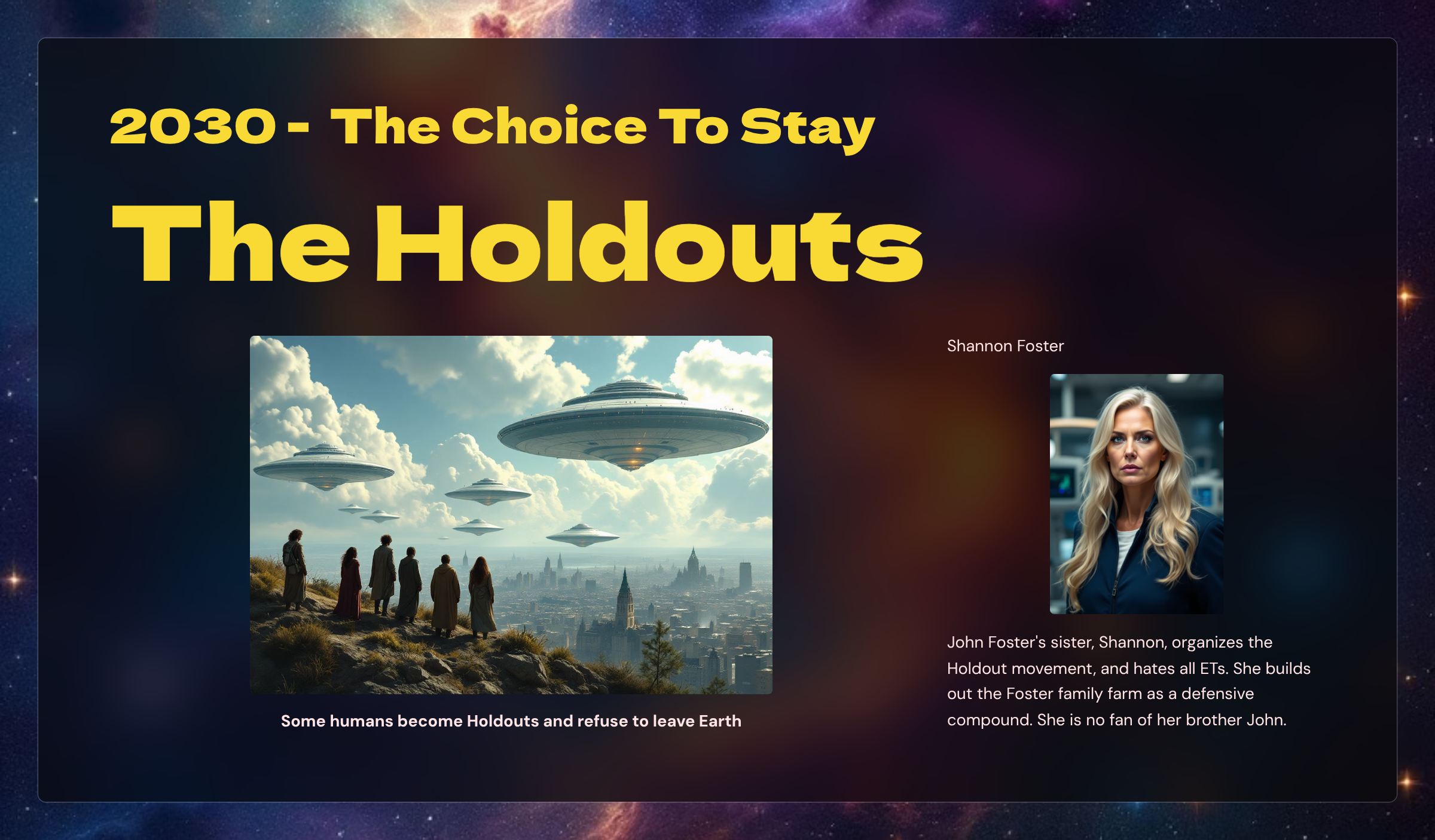 "Mayorga" tells an epic science fiction story spanning over 150 years, centered on John Henry Foster - a hybrid human-ET who becomes humanity's ambassador during Earth's transition from a dying world to an intergalactic civilization. Set primarily between 1925 and 2055, the story combines elements of first contact, cosmic exploration, and humanity's evolution under the guidance of an advanced alien race known as the Zi.